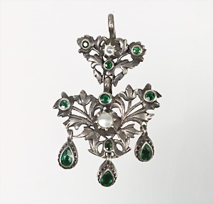 "BAROCK"-Anhänger um 1780/1800, Silber, 7 runde u. ovale, sowie 3 tropfenförmig geschliffen grüne Steine, alle facettiert, 2 Muschel-Perlen, oberer Teil zum Aushängen, H = 49,0 mm
