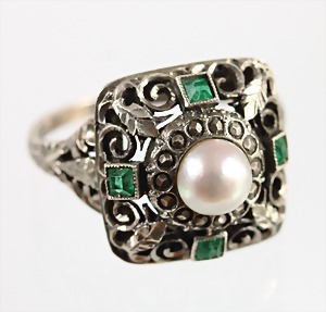 Ring, im Renaissance Stil um 1900er Jahre, Silber 835/000, zentrale Perle mit umlaufendem Markasitenkranz, 4 Smaragde (fac.) im Carré-Schliff, Ringkopf ca. 15,5 x 15,5 mm, Ringkopf u. Seite aufwändig graviert, RW ca. 57,5