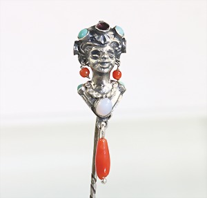 Nadel "MOHR", Italien m 1850, Silber, vollplastisch ausgearbeiteter Kopf besetzt mit Türkisen Granaten, Korallen, 1 Amethyst u. 1 Opal, L = 75,5 mm