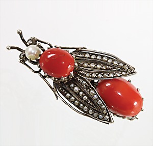 Brosche "KÄFER", um 1850, Silber, 2 Mittelmeer-Korallen, 1 Perle, in den Flügeln sind 40 Stck. 1/2 Perlen eingefasst ! (1 fehlt), ca. 41,5 x 18,8 mm