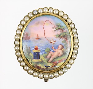 Anhänger um 1840/50 (für Samtband), Silber mit Resten alter Vergoldung, 37 Stck. 1/2 Perlen umrahmen eine liebliche Szene mit einem "PUTTO" u. einer Taube, Emaillemalerei, ca. 28,5 x 31,8 mm. Rückseitig Mechanismus zum Öffnen und Befestigen an einem Samt oder Stoffband !