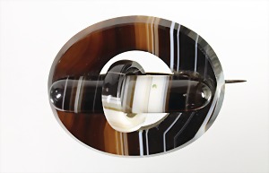 Brosche, "IDAR-OBERSTEIN" um 1860/80, Broschierung Metall, weiß gebänderter Achat, ca. 41,2 x 33,0 mm, (zeittypischer Schmuck, Museum IDAR-OBERSTEIN)