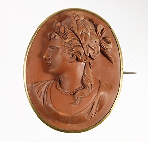 Brosche, ITALIEN um 1880, Tombak verg., Lava, plastisch, ausdrucksstark gearbeitete Frauenbüste, ca. 31,4 x 39,2 mm