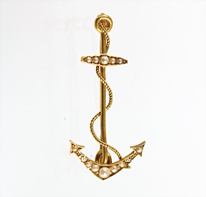 Ziehrliche Brosche "ANKER", um 1880/1900, GG 750/000, 14 St. 1/2 Perlen, H = 33,5 mm