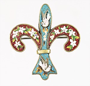 Brosche "LILIE", Italien um 1890/1900, Tombak mit Resten alter Vergoldung, feines Mosaik, zwei weiße Tauben u. Blütenornamente, ca. 39,7 x 42,7 mm