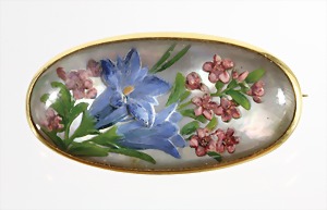 Brosche 1920/30er Jahre "IDAR-OBERSTEIN", GG 585/000, von hinten gravierter Bergkristall (Intaglio) mit feiner Haar-Malerei, im Vordergrund zwei "ENZIAN", rosa Blüten im Hintergrund, ca. 17,3 x 33,5 mm, sehr guter Erhaltungszustand !