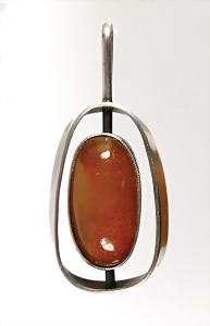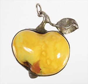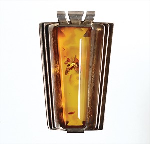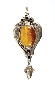 Anhänger, "JUGENDSTIL" um 1910, Bernstein "BUTTERSCOTCH", Silber 935/000, sig: JW (J. WACHENHEIMER Frankfurt/M), schwarzes Emaille, H = 61,7 mm