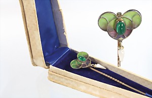 Ansteck-Nadel, "JUGENDSTIL" um 1900, Silber, zentraler Cabochon (grün), Emaille (Plique à jour) in zartem Lila -u. Grün, kl. Flügelperle, H = 6,5 cm, mit Schatulle !