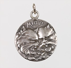 Anhänger, "JUGENDSTIL" um 1905, Silber, 835/000, 2 Katzenköpfe "Miau !", RV. Gravur: von Herrn Dingo 1905, D = 22,5 mm