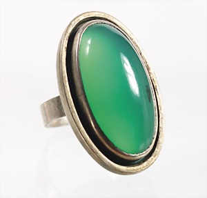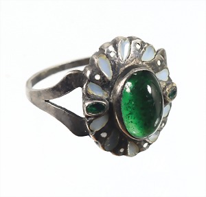 Ring "JUGENDSTIL" um 1900/10, Silber 800/000, mittig grüner Cabochon, zartfarbener Emaillekranz, RW ca. 54