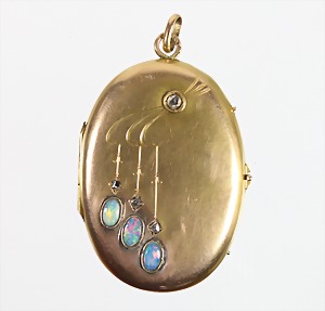Medaillon "JUGENDSTIL", Russland um 1900/10, GG 56 Zolotnik (585/000), sig.: 56 AK (Antip KUZMICHEV) Moskau 1856-1917, Kokoshnik Marke, 3 sehr feine Opalcab., 4 Diamantrosen, feine Gravur, ca. 30,0 x 50,0 mm (mit Öse !)