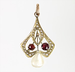 Anhänger "JUGENDSTIL", England um 1900, GG 9 ct, 1 Perltropfen, 2 facettierte Granate u. 26 St. 1/2 Perlen, H = 40,3 mm
