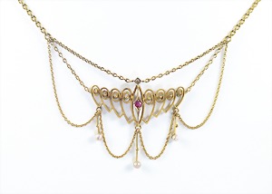 Feines Collier, "ART-DECO" der 1920/30er Jahre, GG 585/000, Mittelteil verziert mit 1 Diamantrose, 1 Rubin u. 3 Natur-Perlen, zarte Kettchen bilden den besonderen Charm, vorne: H = 32,5 mm, kl. Kastenschloss, L = 43,0 cm