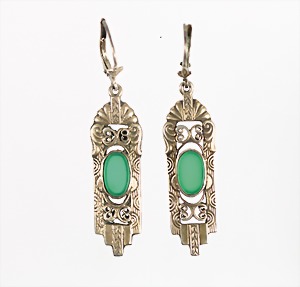 Ohrhänger "JUGENDSTIL" um 1900, Silber (geprüft), grüner Achat, H = 48 mm, Ohrmechaniken mit Klappbügel