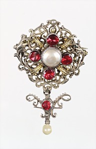 Brosche "BAROCK," 2.Hälfte 18.Jhd., Silber, zentrale Muschelperle umgeben von 4 roten, kreuzförmig angeordneten facettierten Steinen (zinnoxidiertes Glas), den Abschluß bildet ein beweglicher Hänger mit einem weiteren roten Stein u. einer Natur-Perle, H = ca. 45,0 mm