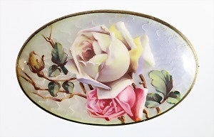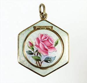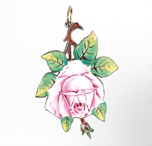 Anhänger "ROSE" um 1910/20er Jahre, Alpacca, punziert: DRGM (DEUTSCHES REICH GEBRAUCHSMUSTER SCHUTZ), Emaille, bemalt, ca. 65,0 x 40 mm