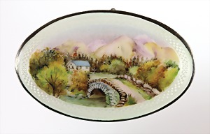 Brosche "HARMONY" (eingraviert), England um 1900/20, Silber 925/000, sig.: W & C°, transluzides Emaille, Emaillemalerei, gouilllochiert, ca., 51,8 x 33,0 mm