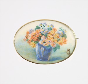 Brosche "BLUMENSTRAUSS", Österreich, Wien um 1880/1900, GG 585/000, Gouache Malerei sig.: MO oder MQ (wohl auf Elfenbein), ca. 29,7 x 21,5 mm. (Ein Versand in Nicht-EU-Länder ist für diesen Artikel leider nicht möglich !)
