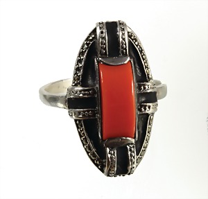 Ring, "ART-DECO" wohl Pforzheim der 1920/30er Jahre, Silber 925/000 (Stempel undeutlich), 1 Koralle, schwarzes Mattemaille, umlaufend mit kl. Markasiten besetzt, Ringkopf. ca. 24,2 x 14,3 mm, RW ca. 57,5