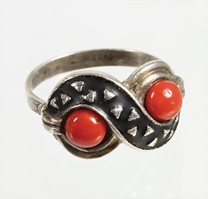 Ring, "ART-DECO" 1920/30er Jahre, Silber 830/00, sig.: HD (Herrmann Drechsler Görlitz), 2 Korallenboutons, schwarzes Mattemaille, RW ca. 59,5