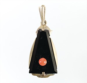 Anhänger, "ART-DECO" 1920/30er Jahre, Silber 935/000, Onyx, Korallenbouton, H = 36,5 mm