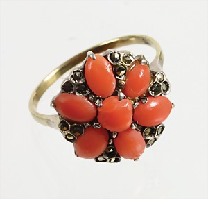 Ring, "ART-DECO" der 1920er Jahre, Ringkopf Silber, Schiene GG 333/000, 7 Korallenboutons, in den Zwischenräumen mit Markasiten ausgelegt, RW ca. 53,5 (Koralle teilweise beschädigt)