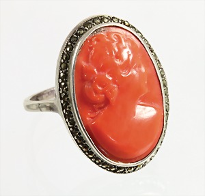 Ring, 1920er Jahre, Silber 835/000, geschnittene Korallengemme, Frauenkopf nach links schauend, umlaufender Markasitenkranz, Ringkopf ca. 17,5 x 22,8 mm, RW ca. 57 (Koralle teilweise beschädigt)
