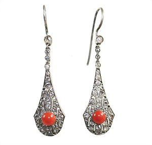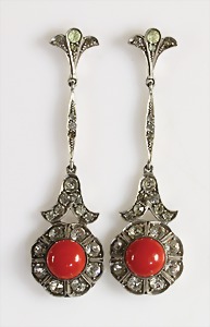 Ohrhänger "ART-DECO" 1930er Jahre, Silber 800/000, sig.: LF, 2 Korallencab., ausgefasst mit weißen Strasssteinen, H = ca. 54,3 mm