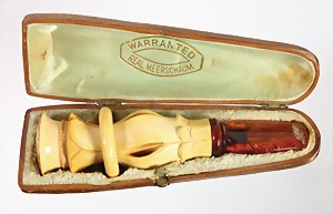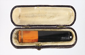 Zigarrenspitze "ART-DECO" 1920/30er Jahre, Bernstein "BUTTERSCOTCH", GG 585/000, L = 66,8 mm, total 6,1 g, Originalschatulle, (vorne kl. Abplatzern)