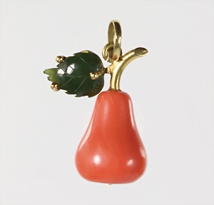 Anhänger "BIRNE", GG 750/000, geschnittene Koralle, graviertes Nephritblatt, H = ca. 27,5 mm, total 3,7 g