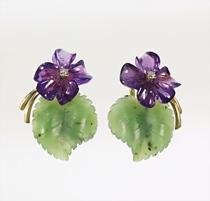 1 Paar Ohrclip "BLÜTEN", GG 585/000, 2 Amethystblüten u. 2 grüne Steinblätter (Nephrit), 2 Diamanten weiß, H = ca. 26,0 mm, als Ohrschmuck gearbeitet, nicht oft zu Finden !!