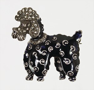 Brosche "PUDEL" 1950er Jahre, Silber 835/000, schwarzes Emaille, Markasiten, rotes Steinauge, plastisch ausgearbeitet, ca. 29,0 x 31,0 mm