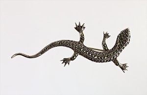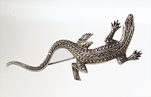 Brosche, "EIDECHSE", ART-DECO 1930/40er Jahre, Silber (geprüft), 2 grüne Steinaugen (facettiert), Körper mit Markasiten ausgefasst, plastisch schön ausgearbeitet, L = 81,5 mm