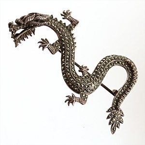 Brosche, "DRACHE", Silber 925/000, Körper mit Markasiten ausgefasst, 2 rote Steinaugen (wohl Rubine), plastisch ausgearbeitet, ca. 63 x 37 mm mm, ausgefallen !