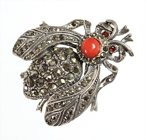 Brosche "KÄFER" 1940/50er Jahre, Silber (geprüft), Korallencab. D = 5,6 mm, 2 Granat-Augen, Körper u. Flügel mit Markasiten ausgefasst, ca. 39,0 x 3,0 mm