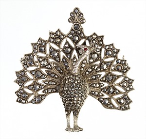 Brosche "ART-DECO" 1930er Jahre, "PFAU", Silber 925/000, 1 rotes Steinauge, plastisch gearbeitet, 40,8 x 40,0 mm