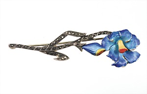 Brosche 1930/40er Jahre, Silber 835/000, farbenfroh emaillierte Blüten, Stiel u. Blätter mit Markasiten ausgefasst, L = ca. 69,5 mm