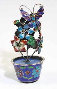 Objekt, Blumentopf mit Blüten, China 1930/50er Jahre, sig.: SILVER, Topf u. Blüten farbenfroh emailliert, oben ein Schmetterling, H = 73,2 mm