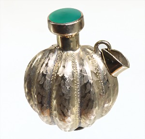 Flacon als Anhänger gearbeitet, Silber, verschraubter Deckel mit grüner Achateinlage, Muster trembliert, H = 34,5 mm
