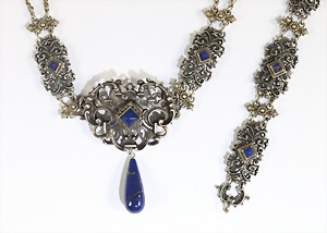 Lot: Armband u. Collier "NEO-RENAISSANCE" um 1880/1900, Silber, Armband, 5 Lapis-Pyramiden, L = 19,5 cm; Collier, 3 Lapis-Pyramiden, 1 Lapistropfen, vorne H = ca. 52,0 mm, ausgefallene Kette mit facettierten Silberoktaedern, L = ca. 44,5 cm
