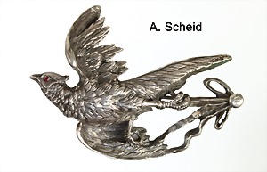 Brosche "FASAN" um 1900, Silber, sig.: G.A.S (Georg Anton SCHEID) Wien, naturalistisch u. vollplastisch detailliert ausgearbeitet, ein rotes Stein-Auge, L = 56 mm