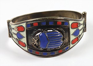 Armreif "SKARABÄUS", 1970/80er Jahre, im ägyptisierenden Stil gearbeitet, Silber 925/000, Emaille in blau, weiß, u. roten Farbtönen, zentral plastisch ausgearbeiteter Skarabäus, innen, ca. 53,7 c 58,8 mm, mit Scharnierbewegung, total 56,5 g