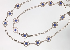 Kette, Silber 925/000, sig.: 59 AR, blaues Emaille "PLIQUE À JOUR", schlichte graphische Elemente, L = 124 cm
