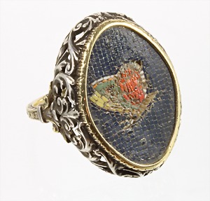 Ring, "MIKROMOSAIK" um 1830/50, "SCHMETTERLING", Silber, Ringschiene u. Fassung aus Gold, seitlich sehr fein ornamentiert. In einer leicht abgerundeten Raute fliegt ein farbig abgesetzter Schmetterling vor einem schwarzen Hintergrund. Ringkopf ca. 17,5 x 24,5 mm, RW ca. 53,5 mm, ausgefallenes Stück !