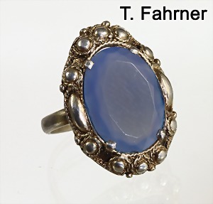 Ring "THEODOR FAHRNER" Pforzheim der 1920/30er Jahre, Silber 935/00, sig.: TF 935, blauer Calcedon (facettiert), Ringkopf ca. 24,0 x 17,5 mm, RW ca. 54