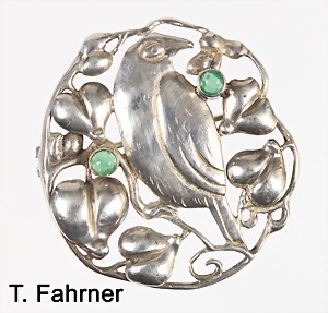 BROSCHE "VOGEL" von "THEODOR FAHRNER" Pforzheim um 1910/15, Silber 835/00, sig: TF 835, 2 grüne Cabochons, ca. H = 38,8 mm; B = 36,0 mm, plastisch schön ausgearbeitete Blätter ! Literatur bei Arnoldsche "THEODOR FAHRNER SCHMUCK" 1.144, S. 147