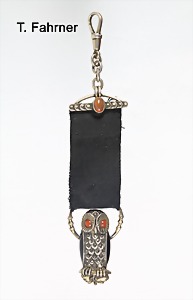 Chatteleine, ART-DECO um 1930, "THEODOR FAHRNER, Silber 835/000, sig.: TF 835, die plastisch ausgearbeitete Eule ist mit Markasiten ausgefasst, die Flügel schwarz emailliert. In den Augen sitzen zwei orange-braune Steinaugen, schwarzes Stoffband mit Karabiner, sehr guter originaler Erhaltungszustand, H = 127,5 mm, absolute Rarität !!