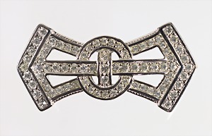 Brosche, im typischen "ART_DECO" Stil, silberfarben, weißer Strass, L = 56,0 mm