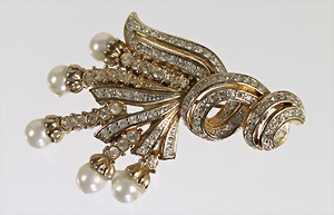 filigrane Brosche, goldfarben, unsigniert, weißer Strass, an den Spitzen Kunstperlen, plastisch ausgearbeitet, L = 45,5 mm