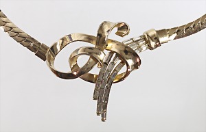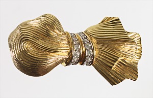 Brosche "SCHLEIFE", von "NINA RICCI" USA, goldfarben, signiert: NINA RICCI, 2 Reihen weißer Strass, strukturierte Oberfläche, L = 58,0 mm